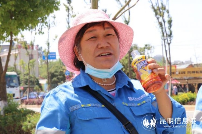 “再熱的天我們也會穿著長袖工服,帽子口罩必不可少,當(dāng)然這樣的話干起活來就會更熱了?!币呀?jīng)在一線崗位上干了快3年的王正玲說道。昆明人都知道,雨季來臨前的這段日子是這座城市最熱的時候,為了能讓在路段作業(yè)的環(huán)衛(wèi)工人們不那么辛苦,每年5月底“清涼一夏”的慰問活動便成了云南京環(huán)盤宸公司的“規(guī)定動作”,既送去了公司對職工的關(guān)愛,也送來了一絲絲清涼。事業(yè)五部經(jīng)理助理邵銀萍在發(fā)放解暑飲品時關(guān)切地說道:“大家辛苦啦,覺得太熱的時候就休息一下,以防中暑,在干好工作的同時,也要保護好自己的身體!”接過慰問品的王大姐擰開冰紅茶的蓋子喝了起來,還不時與旁邊的同事“干杯”,“這些飲品發(fā)放得太及時了,讓我們心里暖暖的!”環(huán)衛(wèi)工人們紛紛感嘆道。