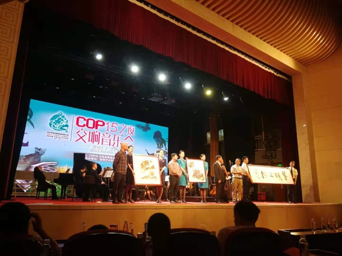 音樂會(huì)上,云南省文聯(lián)副主席、云南省美術(shù)家協(xié)會(huì)主席、著名畫家、云南畫院院長(zhǎng)羅江先生,書法博士、云南“文化名家”獲得者、云南大學(xué)藝術(shù)與設(shè)計(jì)學(xué)院碩士研究生導(dǎo)師、云南省書法家協(xié)會(huì)副主席成聯(lián)方先生,中央美術(shù)學(xué)院博士,中國(guó)畫學(xué)會(huì)理事,云南藝術(shù)學(xué)院教授、碩士生導(dǎo)師、中國(guó)畫書法系主任滿江紅先生等云南藝術(shù)家們也將他們創(chuàng)作的COP15主題作品帶到了現(xiàn)場(chǎng),并捐贈(zèng)給COP15云南省籌備辦。