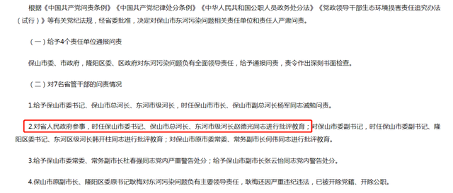 盡管已不在保山任職,趙德光還是出現(xiàn)在了問責(zé)通報中:對云南省人民政府參事,時任保山市委書記、保山市總河長、東河市級河長趙德光同志進行批評教育。