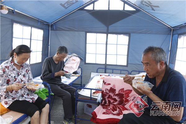 搶在下雨前搭好帳篷23日上午,記者來到秀嶺村委會(huì)秀嶺村民小組,趙春麗、趙春斌兩姐弟胸佩黨徽,正帶領(lǐng)集中安置點(diǎn)的村民們用帆布搭建臨時(shí)廚房?!耙幌掠?,露天廚房就不方便使用。今早我專門回家,從倒塌的土墻下翻出了這兩卷帆布。”趙春斌平日在巍山打工,22日一早專程趕回秀嶺村,幫助村民抗震救災(zāi)。天氣預(yù)報(bào)說24日有雨,他們要趕在下雨前搭建好安置點(diǎn)22戶村民共同使用的臨時(shí)廚房。24日中午,記者來到漾濞縣人和廣場(chǎng)安置點(diǎn),居民施繼權(quán)一家正在帳篷里吃盒飯?!霸琰c(diǎn)、午飯、晩飯都有提供,有時(shí)自己去拿,有時(shí)志愿者送來,除了中午天氣有點(diǎn)熱,生活在這里挺安適的。”人和廣場(chǎng)是漾濞縣城中最大的一個(gè)居民集中安置點(diǎn),共有161頂帳篷,22日凌晨4點(diǎn)開始對(duì)民眾開放,當(dāng)天就住滿。安置點(diǎn)每天下午6:00以后統(tǒng)計(jì)清理,將空置的帳篷優(yōu)先安排給老人和兒童居住。“周邊的老百姓都是安置對(duì)象,帳篷里有折疊床、棉被,定期進(jìn)行方便面、面包、火腿腸、礦泉水等物資發(fā)放。”在人和廣場(chǎng)安置點(diǎn)為群眾提供服務(wù)保障的漾濞縣委組織部副部長(zhǎng)范曙程介紹,安置點(diǎn)專門設(shè)立了黨員服務(wù)站,成立了倉(cāng)括工作人員和安置居民的40人黨員先鋒隊(duì),為安置點(diǎn)群眾提供服務(wù)。