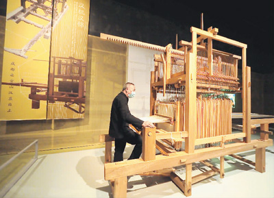 工作人員在復(fù)原的漢代提花機(jī)上演示織錦。杜建坡攝