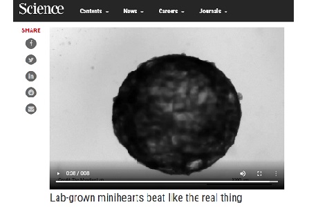 研究小組發(fā)現(xiàn)這顆“迷你”心臟有一個(gè)清晰的心室,可有節(jié)奏地收縮,從而擠壓腔內(nèi)的液體。其每分鐘跳動(dòng)60到100次,這與相同年齡大小的心臟的速率相同。