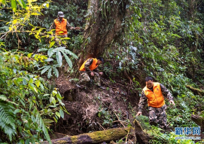 護(hù)林員楊有山(中)和同事在山間巡護(hù)(3月14日攝)。新華社記者 陳欣波 攝