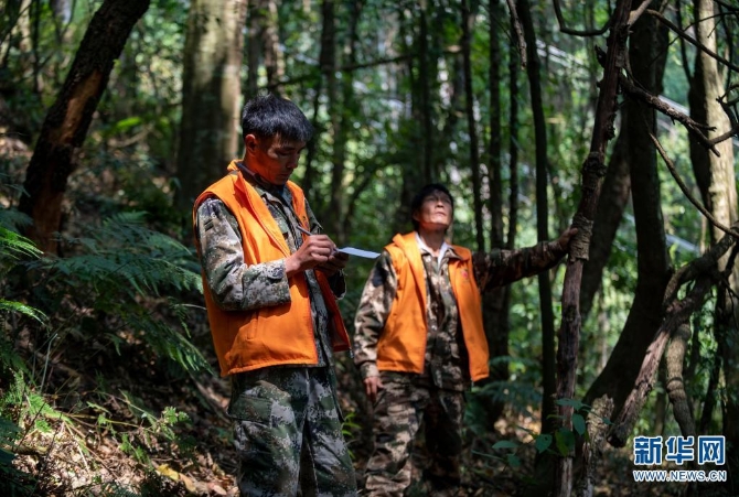 護(hù)林員楊有山(左)在林間記錄天行長臂猿家庭的活動(dòng)情況(3月15日攝)。新華社記者 陳欣波 攝