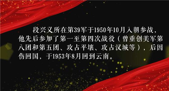 此后,段興義因傷回國(guó),于1953年8月回到云南?;貒?guó)后,段興義多次被組織推薦保送,在云大附中、云南師范大學(xué)中文系學(xué)習(xí)文化知識(shí)。畢業(yè)之后,段興義工作履歷涉及中學(xué)、供銷社,最后以供銷社黨支部書記的身份退休。