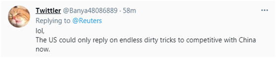一些網(wǎng)友則聯(lián)想到了與中國的競(jìng)爭(zhēng)。有網(wǎng)友諷刺稱,“呵呵,美國現(xiàn)在只能用沒完沒了的骯臟伎倆來與中國競(jìng)爭(zhēng)?!?/p>