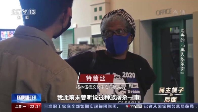 塔爾薩種族屠殺幸存者后代、塔爾薩市議員 凡妮莎·霍爾-哈珀:有人提及塔爾薩“黑人華爾街”發(fā)生過種族暴亂,我完全不知道他們在說什么,什么種族暴亂,我就住在離事發(fā)地“黑人華爾街”以北7個街區(qū)的地方,這是一個秘密,這是禁忌,有人刻意為之讓屠殺歷史成為一個秘密。