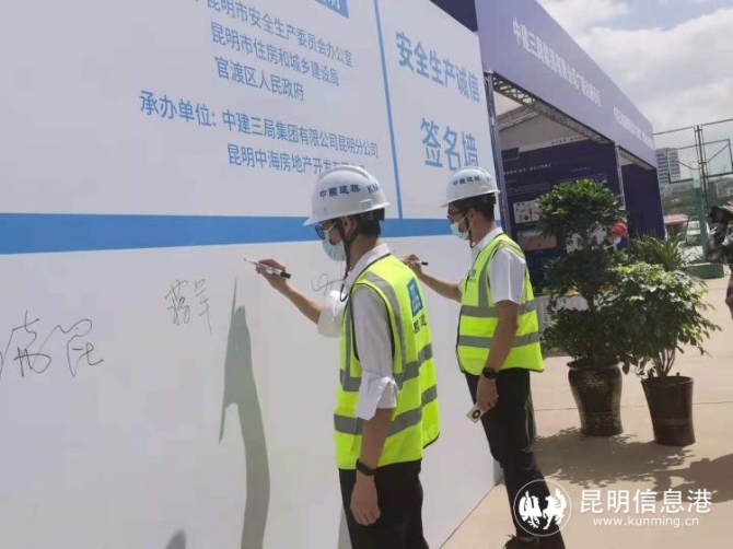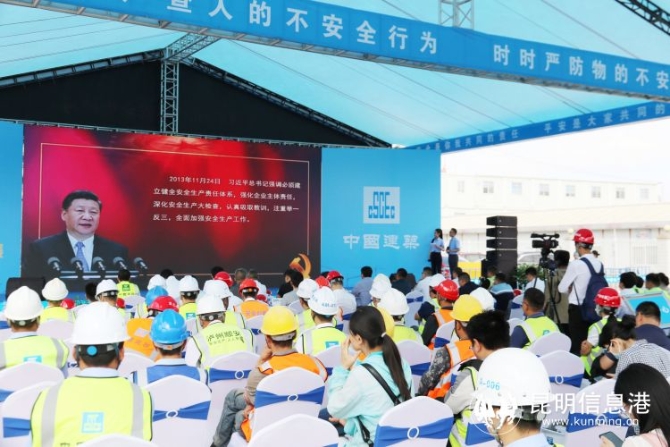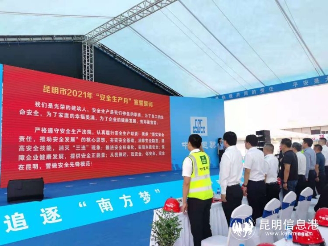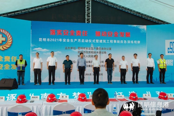 昆明信息港訊 記者張蕊 2021年6月,是我國第20個全國“安全生產(chǎn)月”。6月1日,昆明市2021年“安全生產(chǎn)月”啟動儀式暨建筑工程事故應(yīng)急演練觀摩活動,在昆明市官渡區(qū)中建三局寰宇花園項目部舉行。本次主題為“落實安全責任 推動安全發(fā)展”的安全生產(chǎn)月啟動儀式,由昆明市安全生產(chǎn)委員會辦公室、昆明市住房和城鄉(xiāng)建設(shè)局、官渡區(qū)人民政府主辦,中建三局昆明分公司、昆明中海房地產(chǎn)開發(fā)有限公司承辦,旨在動員各級各部門進一步強化安全發(fā)展理念,壓實安全生產(chǎn)責任,消除事故隱患,切實維護人民群眾生命財產(chǎn)安全,為經(jīng)濟社會高質(zhì)量發(fā)展保駕護航。