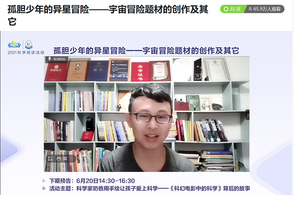 日前,中國科普作家協(xié)會2021科學閱讀活動(第一季)第七期邀請科幻作家馬傳思和北京景山學校正高級語文教師周群,就“孤膽少年的異星冒險——宇宙冒險題材的創(chuàng)作及其它”做主題分享。活動由中國科普作家協(xié)會、中國科幻研究中心主辦,《科學故事會》雜志協(xié)辦,在新華網(wǎng)等平臺同步直播,線上觀看人次接近80萬。