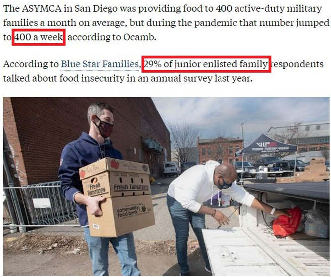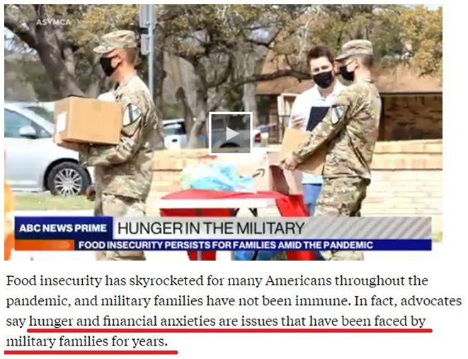 在新冠肺炎大流行期間,許多美國低收入者的食品安全狀況急劇惡化,軍人家庭也未能幸免。事實(shí)上,饑餓和經(jīng)濟(jì)焦慮是美國軍人家庭多年來一直面臨的問題。