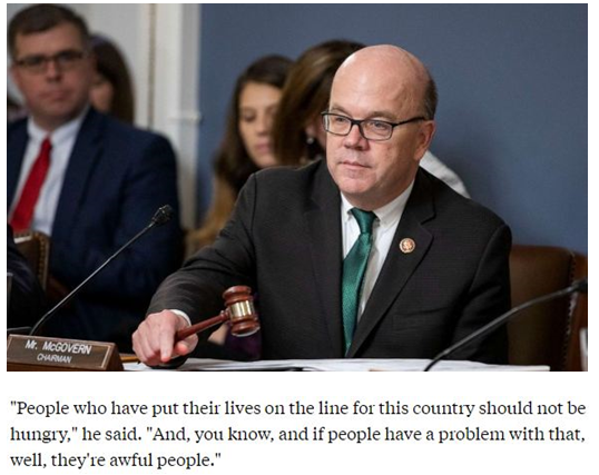 正在參與應(yīng)對(duì)美國饑餓問題的美國會(huì)眾議院規(guī)則委員會(huì)主席吉姆·麥戈文也認(rèn)為,軍人家庭為吃飯發(fā)愁是不可接受的事情。“為這個(gè)國家獻(xiàn)出生命的人們不應(yīng)該挨餓。如果有誰覺得這話不對(duì),那么他們就是壞人”。