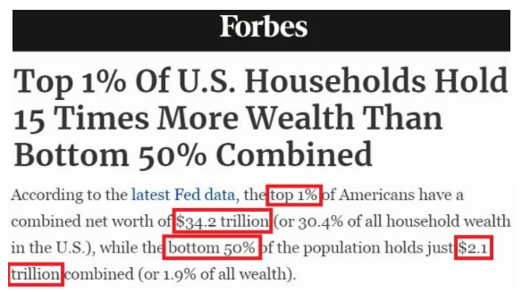 美聯(lián)儲(chǔ)最新數(shù)據(jù)顯示,美國最富有的1%人口的凈資產(chǎn)總額達(dá)到34.2萬億美元,占美國所有家庭財(cái)富的30.5%;最貧窮的50%人口的凈資產(chǎn)總額僅為2.1萬億美元,占美國全部財(cái)富的1.9%。換言之,1%美國超級(jí)富豪的財(cái)富是50%美國窮人財(cái)富的15倍。