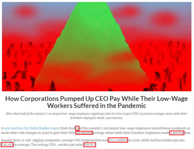 美國政策研究學(xué)會(huì)(IPS)近期調(diào)查發(fā)現(xiàn),在疫情期間低收入工人失去收入、工作甚至生命的同時(shí),美國許多頂級(jí)企業(yè)卻一邊以疫情為借口大舉裁員,一邊挖空心思為企業(yè)高管牟取不正當(dāng)暴利。