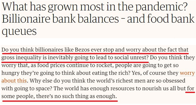 英國《衛(wèi)報(bào)》日前以《疫情中增長最快的是什么?億萬富翁的存款和食物救濟(jì)站前的長隊(duì)》為題發(fā)文譏諷說,在美國這樣的國家,一些人的災(zāi)難往往成為另一些人的發(fā)財(cái)機(jī)會(huì)?!澳阏J(rèn)為像(亞馬遜老板)貝索斯這樣的億萬富翁會(huì)停下手來擔(dān)心嚴(yán)重的不平等將不可避免地導(dǎo)致社會(huì)動(dòng)蕩嗎”,“對(duì)于有些人來說,沒有夠了的時(shí)候”。