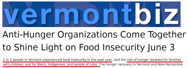 以佛蒙特州為例。該州有三分之一的居民在過去一年中經(jīng)歷了食品短缺,而少數(shù)族裔和有孩子的家庭一樣,饑餓風(fēng)險(xiǎn)要比其他群體高出一倍。
