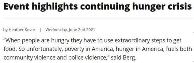 在他看來,饑餓、貧窮、暴力以及種族沖突等現(xiàn)象之間存在著密切關(guān)聯(lián)。“當(dāng)人們饑餓時(shí),他們不得不采取特別手段來獲得食物。所以不幸的是,美國的貧困和饑餓同時(shí)助長了社區(qū)暴力和警察暴力”。