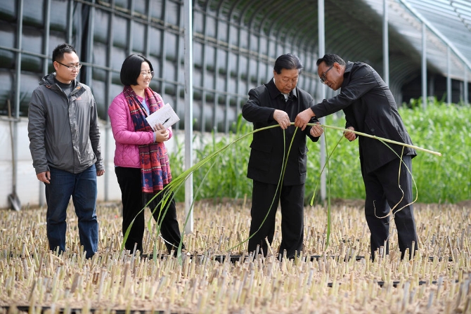 2021年3月29日,在閩寧鎮(zhèn),林占熺(右二)與農(nóng)戶交流菌草種植技術(shù)。新華社記者王鵬攝