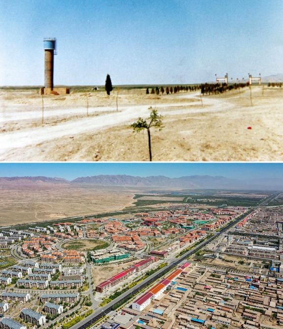 拼版照片:上圖為閩寧鎮(zhèn)建設(shè)初期的資料照片;下圖為2021年6月3日拍攝的閩寧鎮(zhèn)(無(wú)人機(jī)照片,新華社記者馮開(kāi)華攝)。