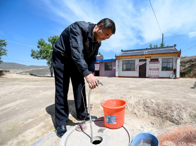 2021年5月20日,寧夏固原市西吉縣震湖鄉(xiāng)毛坪村村民魏繼明在家中院子里接自來(lái)水(新華社記者馮開(kāi)華攝)。
