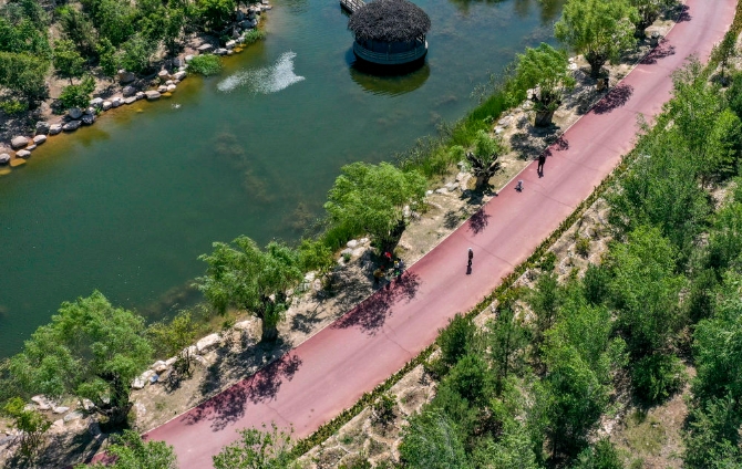 2021年5月24日,市民在銀川市賀蘭山運(yùn)動(dòng)休閑公園散步游覽(無(wú)人機(jī)照片)。新華社記者馮開(kāi)華攝
