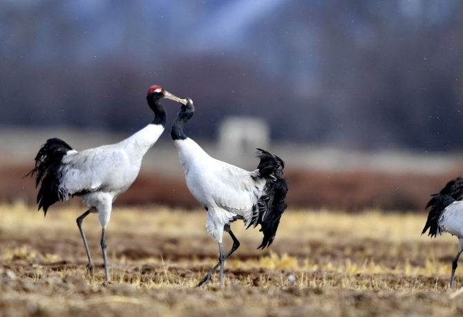 黑頸鶴在林周縣黑頸鶴自然保護(hù)區(qū)里“親吻”(2021年3月14日攝)。新華社記者 張汝鋒 攝