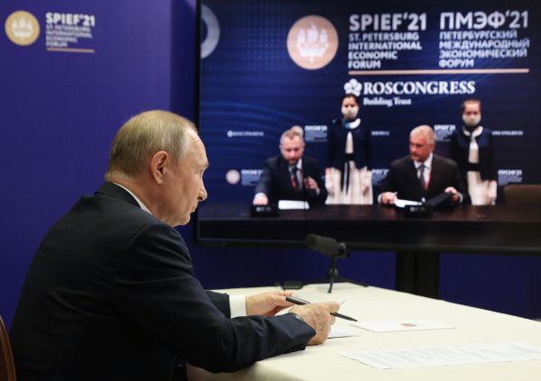 普京(左)3日通過視頻出席圣彼得堡國際經(jīng)濟(jì)論壇活動(dòng)(俄羅斯衛(wèi)星社)