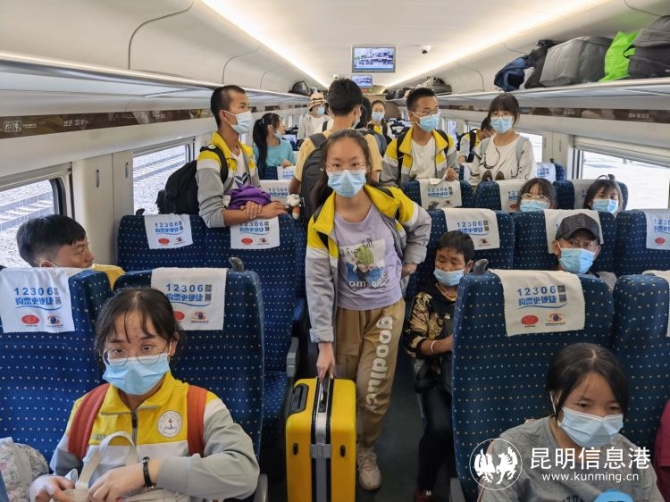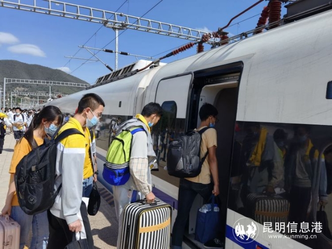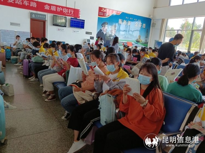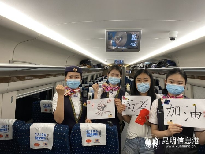 昆明信息港訊 記者上官艷君 “各位同學,祝你們今年高考能夠取得好成績!”6月4日,廣通中學287名學生在廣通北站乘坐動車前往祿豐縣城參加高考,車站客運員王劉志貼心為考生們加油打氣。