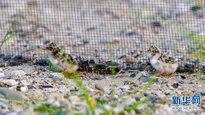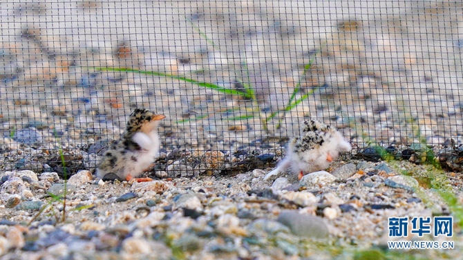 剛出生的河燕鷗在保護網(wǎng)中(攝于2021年5月)。新華網(wǎng)發(fā)(尹以祜 攝)