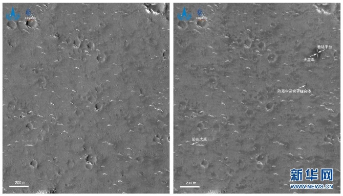 6月7日,國家航天局發(fā)布我國首次火星探測(cè)天問一號(hào)任務(wù)著陸區(qū)域高分影像圖。圖像中天問一號(hào)著陸平臺(tái)、祝融號(hào)火星車及周邊區(qū)域情況清晰可見。新華社發(fā)(國家航天局供圖)