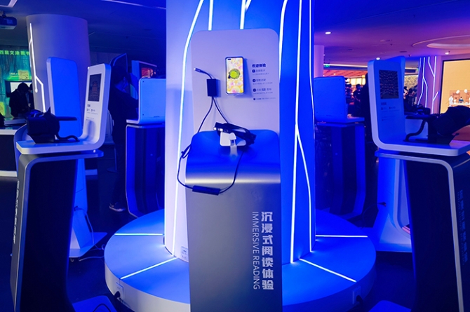 “全景展廳”首次采用270度環(huán)繞的LED三折屏幕,實現(xiàn)巨幕裸眼VR效果,讀者置身于三面超高清大屏環(huán)繞的全景空間,可獲得較強(qiáng)的沉浸感和真實的畫面感?!伴喿x樹”將移動智能設(shè)備、VR設(shè)備與樹形展架有機(jī)結(jié)合,讀者可通過現(xiàn)場不同的VR設(shè)備終端,觀看古代典籍、國畫、文物古跡、城市印象等不同類型的VR視頻資源。