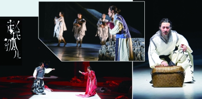 蒼涼的城墻在舞臺上斜立,一個孤獨幼小的靈魂悄然立于石階,他的吟唱,召喚出古老的“復(fù)仇”故事。程嬰、屠岸賈、程勃、公孫杵臼、公主等一眾人物定格于畫框之中,緩緩“移”向舞臺,再次走入歷史的風(fēng)沙……