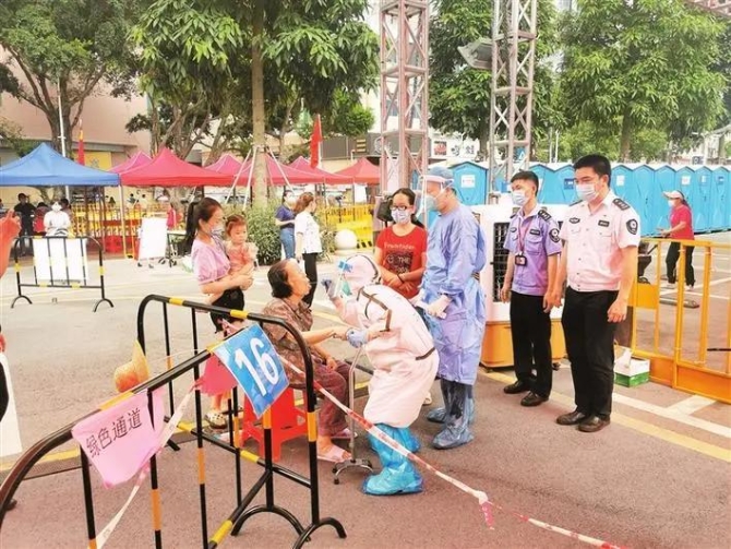 “在采樣現(xiàn)場,由于天氣炎熱,且排隊(duì)人多,現(xiàn)場工作人員會(huì)充分考慮到市民個(gè)人的特殊情況,會(huì)視情況進(jìn)行靈活應(yīng)變,充分體現(xiàn)人文關(guān)懷?!睋?jù)謝禮介紹,今天,一位七八十歲的老人家前來采樣,她行動(dòng)非常緩慢。社區(qū)網(wǎng)格員立即協(xié)調(diào)醫(yī)護(hù)人員和消殺組在檢測入口就協(xié)助老人家完成核酸采樣工作。此外,采樣現(xiàn)場還設(shè)有針對老人和小孩的綠色通道,方便他們進(jìn)行核酸采樣。