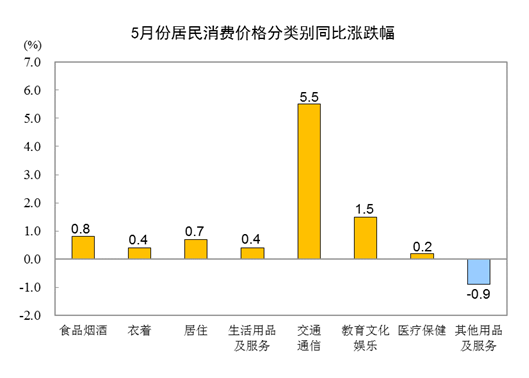 其他七大類價格同比六漲一降。其中,交通通信、教育文化娛樂、居住價格分別上漲5.5%、1.5%和0.7%,衣著、生活用品及服務(wù)、醫(yī)療保健價格分別上漲0.4%、0.4%和0.2%;其他用品及服務(wù)價格下降0.9%。