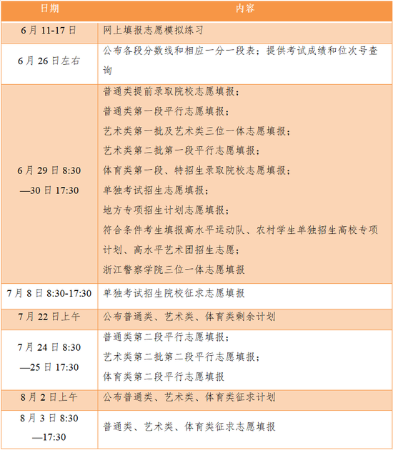 所有考生高考志愿均實(shí)行網(wǎng)上填報(bào),浙江省教育考試院網(wǎng)站(www.zjzs.net)為填報(bào)志愿的唯一網(wǎng)站。具體各類別、各段志愿填報(bào)時(shí)間如下: