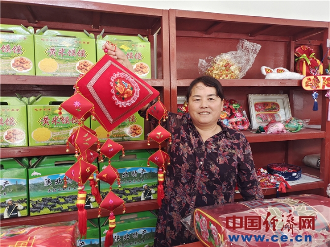 圖為宗艷琴在百貨公司的柜臺后展示合作社的“巧媳婦”們繡制的手工藝品。經(jīng)濟日報-中國經(jīng)濟網(wǎng)記者梁木 攝