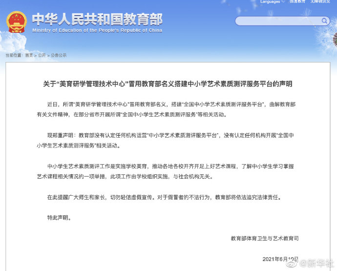 教育部10日發(fā)布聲明稱,近日,所謂“美育研學(xué)管理技術(shù)中心”冒用教育部名義,曲解教育部有關(guān)文件精神,在部分省市開展所謂“全國中小學(xué)生藝術(shù)素質(zhì)測評服務(wù)”等相關(guān)活動。教育部聲明表示,教育部沒有認定任何機構(gòu)運營“中小學(xué)藝術(shù)素質(zhì)測評服務(wù)平臺”,沒有認定任何機構(gòu)開展“全國中小學(xué)生藝術(shù)素質(zhì)測評服務(wù)”相關(guān)活動。中小學(xué)生藝術(shù)素質(zhì)測評工作由學(xué)校組織實施,與社會機構(gòu)無關(guān)。教育部提醒廣大師生和家長,切勿輕信虛假宣傳。(新華社 記者胡浩)
