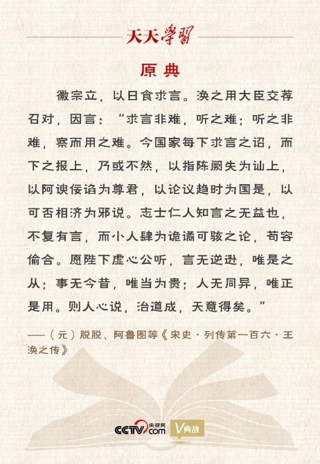 1100年,宋徽宗即位后出現(xiàn)日食,經(jīng)大臣推薦,王渙之應(yīng)召入朝言政。他勸諫新君:“求言非難,聽之難;聽之非難,察而用之難?!毕M兆凇疤撔墓?,言無逆遜,唯是之從”。意思是虛心聽取各方意見,無論所言逆耳還是順耳,只要是正確意見都應(yīng)當(dāng)聽從?;兆凇靶廊谎蛹{”,并想任命他為諫官、御史之職。王渙之以“臣由大臣薦,不可以居是官”為由,堅(jiān)辭不受。