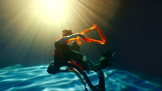 《端午奇妙游》的水下舞蹈節(jié)目《祈》便完美再現(xiàn)了這一場景。舞蹈演員在水下起舞,狀若飛天:水隨舞動,衣袂翩躚;拂袖起舞,撥裙回轉(zhuǎn);水乳融合,纏綿繾綣……據(jù)介紹,舞蹈《祈》是為了表現(xiàn)端午拴五色絲線祈福的習俗。