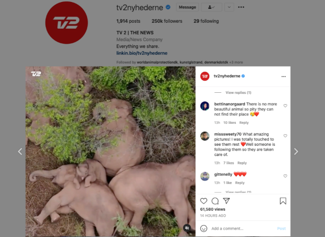 丹麥TV2新聞臺(tái)在其網(wǎng)站和社交媒體賬戶上報(bào)道亞洲象“不可思議”的北上遷徙,并配發(fā)視頻,獲得大量點(diǎn)擊和評(píng)論。丹麥民眾在TV2 Instagram上的留言是一邊倒的“有愛”,以及對(duì)家庭親情的共鳴。