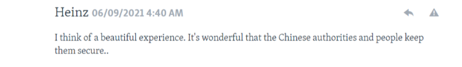 名為Heinz的網(wǎng)友說:“中國(guó)政府和人民保護(hù)了它們的安全,真是太好了!”