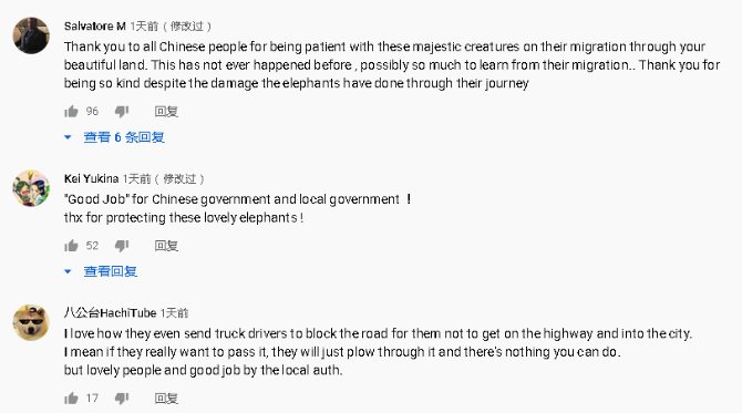 法國(guó)24電視臺(tái)在優(yōu)兔發(fā)布大象的視頻短片后,名為Salvatore的網(wǎng)友留言說:“謝謝中國(guó)民眾對(duì)這些正在你們美麗國(guó)度遷徙的龐大動(dòng)物保持耐心……盡管大象沿途造成很多破壞,但謝謝你們對(duì)它們?nèi)绱擞焉啤!?/p>