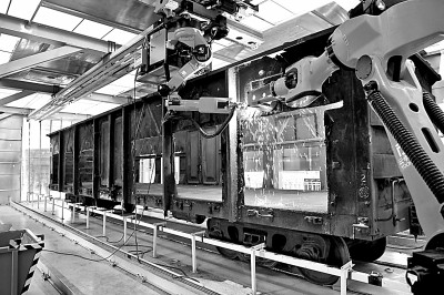 安徽合肥,報廢鐵路貨車被機器人自動拆解,通過深加工變成農機具、五金件等產品。 新華社發(fā)