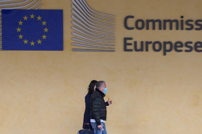 5月4日,人們在比利時(shí)布魯塞爾的歐盟委員會總部外行走。新華社記者 鄭煥松 攝