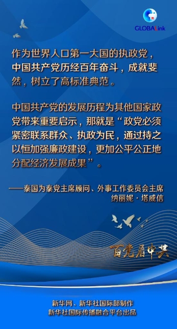 泰國(guó)為泰黨主席顧問(wèn)、外事工作委員會(huì)主席納麗妮·塔威信日前接受新華社記者專訪,高度贊揚(yáng)中國(guó)共產(chǎn)黨領(lǐng)導(dǎo)下的中國(guó)在取得高速發(fā)展同時(shí),愿意與其他國(guó)家分享經(jīng)驗(yàn)、共建美好未來(lái),并強(qiáng)調(diào)“一帶一路”倡議是中國(guó)共產(chǎn)黨令人矚目的創(chuàng)新成就。