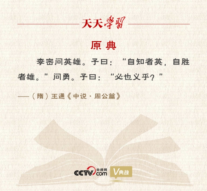 《中說·周公篇》記載了李密與文中子王通的一段對話。李密問何謂英雄?文中子答道:“自知者英,自勝者雄。”意思是能夠正確評價自己,并且克服各種私心雜念、戰(zhàn)勝自己的人,才是英雄。