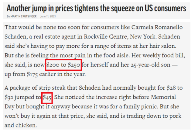 生活在紐約的卡梅拉·沙登最近的日子過得越來越緊,最讓她發(fā)愁的是吃喝問題:她和兒子每周的伙食費(fèi)從年初的175美元增加到現(xiàn)在的200到250美元;她以前花28至32美元就能買到的一盒牛排現(xiàn)在漲到了45美元。