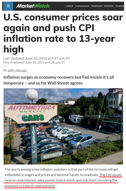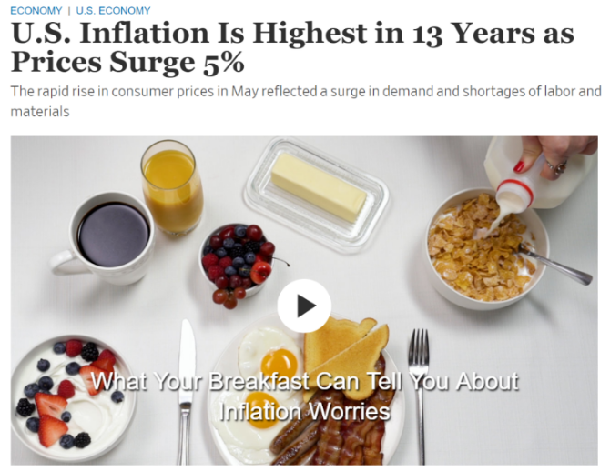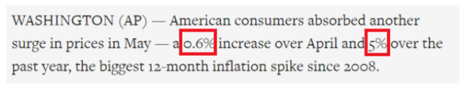 數(shù)據(jù)顯示,美國5月份消費(fèi)者價(jià)格指數(shù)(CPI)比4月份上漲0.6%,比去年同期上漲5%,這是自2008年以來最大的12個(gè)月通脹幅度。