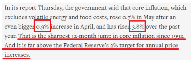 4月核心通脹率(不包括波動(dòng)較大的能源和食品價(jià)格)漲幅為0.9%,較去年同期上漲3.8%,是自1992年以來核心通脹率12個(gè)月最大漲幅,也遠(yuǎn)遠(yuǎn)高于美聯(lián)儲(chǔ)2%的年度物價(jià)上漲目標(biāo)。