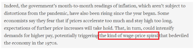 一些經(jīng)濟(jì)學(xué)家擔(dān)心,如果物價(jià)上漲過快,在高位停留的時(shí)間過長(zhǎng),對(duì)物價(jià)持續(xù)上漲的預(yù)期將根深蒂固。反過來,這可能會(huì)加劇人們對(duì)加薪的要求,就有可能引發(fā)上世紀(jì)70年代困擾美國經(jīng)濟(jì)的那種情況:工資——物價(jià)螺旋上升。