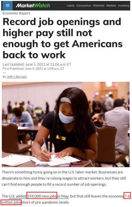 與此同時(shí),美國勞動(dòng)力市場(chǎng)出現(xiàn)了一些滑稽的情況:5月新增55.9萬個(gè)就業(yè)崗位,但仍比疫情前少760萬個(gè)。一方面是失業(yè)率仍然居高不下,另一方面,很多迫切需要招聘的企業(yè),即便提高工資以吸引工人,還是無法找到足夠的人手填補(bǔ)創(chuàng)紀(jì)錄數(shù)量的職位空缺。